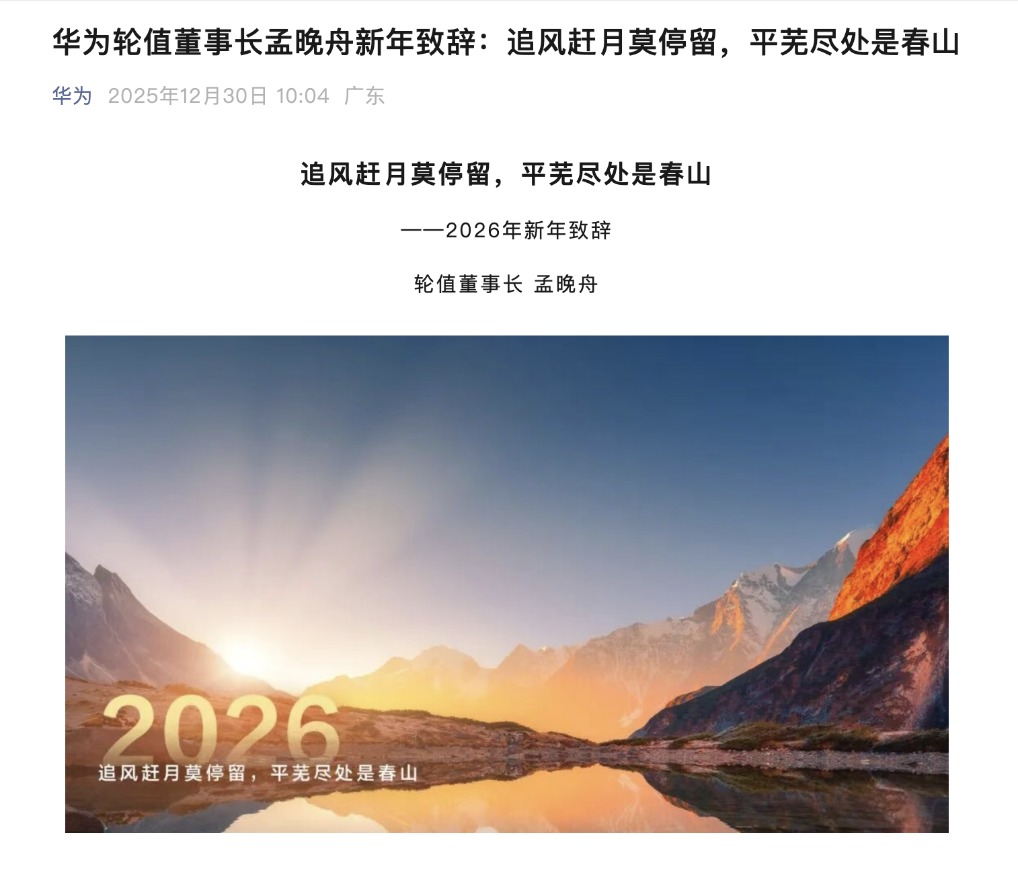 12月30日上午,华为官方公众号发布了轮值董事长孟晚舟的2026年新年致辞《追风赶月莫停留,平芜尽处是春山》。在致辞中,孟晚舟表示,人工智能技术正加速与行业知识融合,从单点效率提升转向对企业核心业务的系统性价值重构。这场转变不仅是技术的迭代,更是从组织架构、业务流程到企业文化的一次深刻变革。