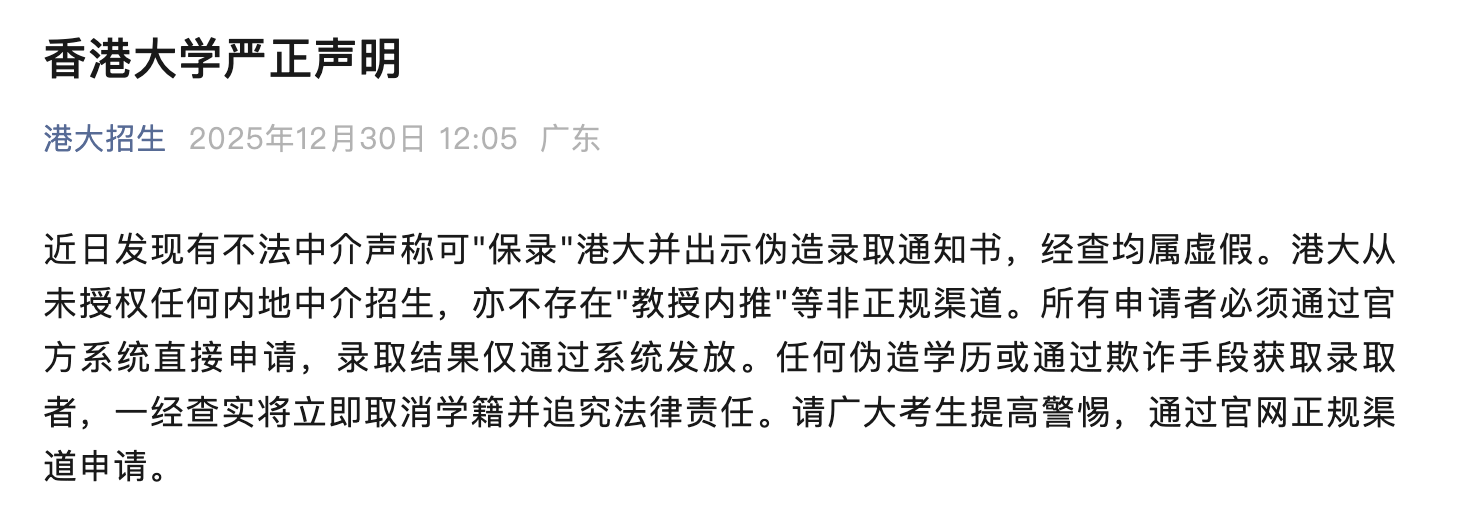 12月30日,“港大招生”微信公众号发布严正声明:近日发现有不法中介声称可"保录"港大并出示伪造录取通知书,经查均属虚假。港大从未授权任何内地中介招生,亦不存在“教授内推”等非正规渠道。所有申请者必须通过官方系统直接申请,录取结果仅通过系统发放。任何伪造学历或通过欺诈手段获取录取者,一经查实将立即取消学籍并追究法律责任。请广大考生提高警惕,通过官网正规渠道申请。