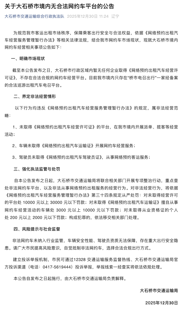 12月30日,辽宁营口大石桥市交通运输局发布《关于大石桥市境内无合法网约车平台的公告》。公告表示,截至本公告发布之日,大石桥市行政区域内暂无任何企业取得《网络预约出租汽车经营许可证》,不存在合法合规的网约车经营平台。目前该市境内只存在“桥市电召出行”一家经备案的合法巡游出租汽车电召平台。大石桥市交通运输局将联合相关部门开展专项整治行动,重点查处非法网约车平台、以及非法从事网络预约出租服务的经营行为。