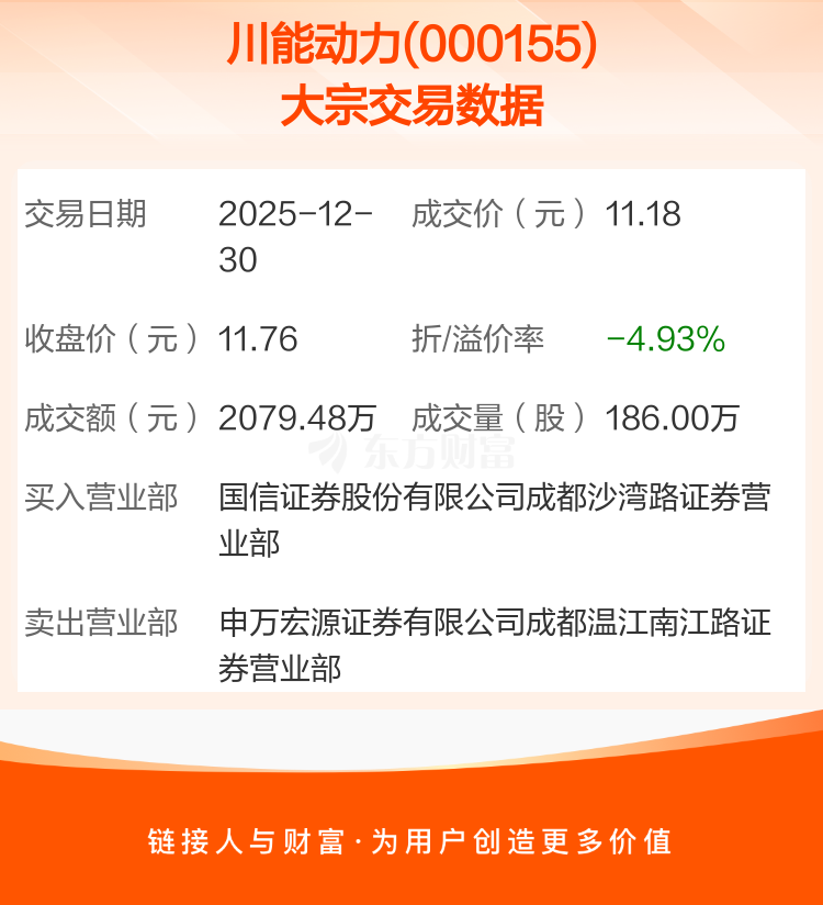 大宗交易:川能动力成交2079.48万元,折价4.93%(12-30)