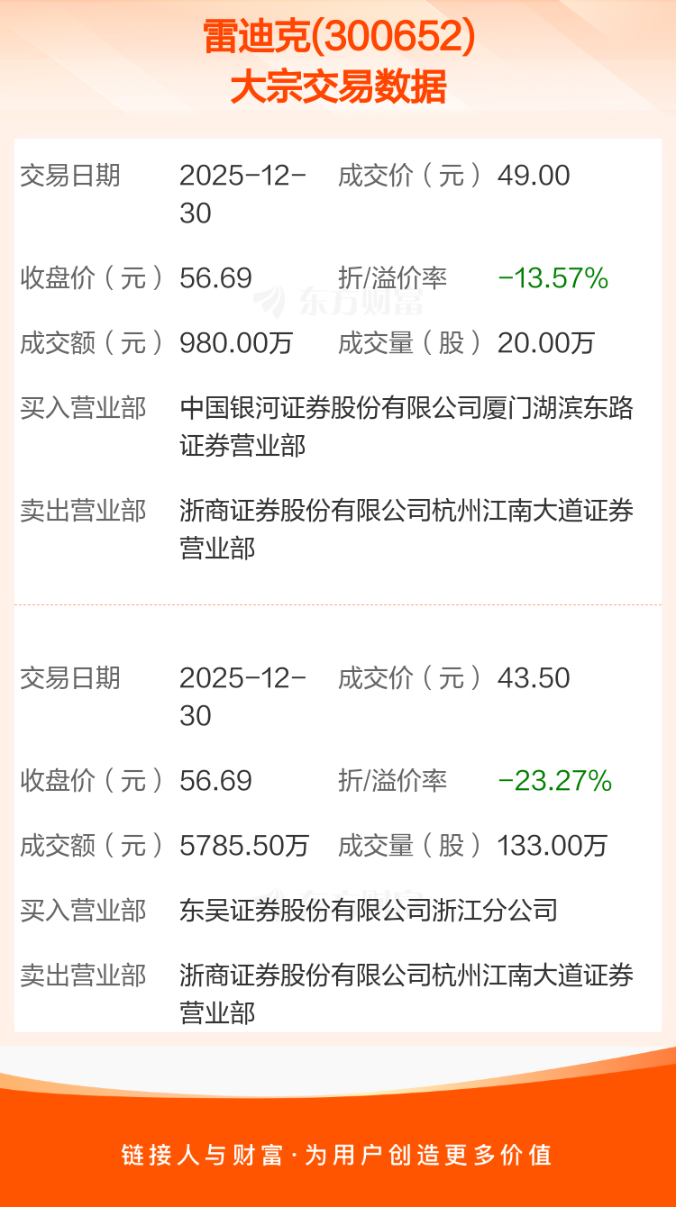 2025年12月30日,雷迪克发生2笔大宗交易,共成交153.00万股,成交金额6765.50万元,占其流通市值比例为1.00%。