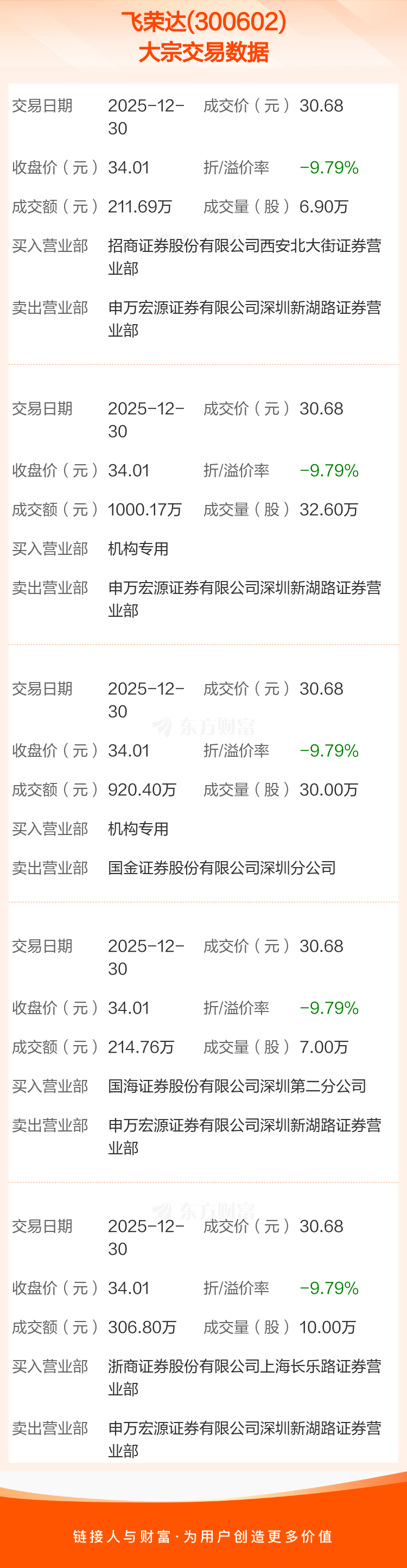 大宗交易:飞荣达成交2653.82万元,折价9.79%(12-30)