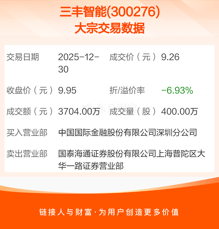 2025年12月30日,三丰智能发生1笔大宗交易,共成交400.00万股,成交金额3704.00万元,占其流通市值比例为0.35%。