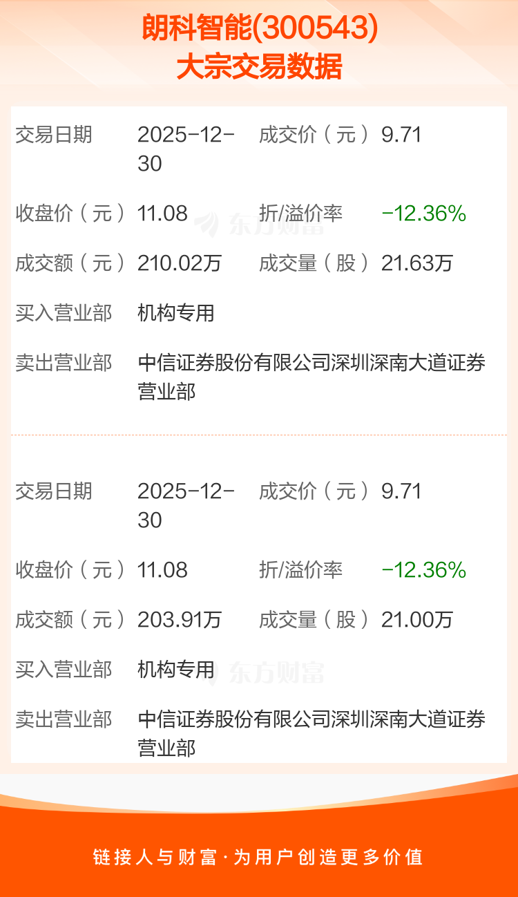 2025年12月30日,朗科智能发生2笔大宗交易,共成交42.63万股,成交金额413.93万元,占其流通市值比例为0.15%。