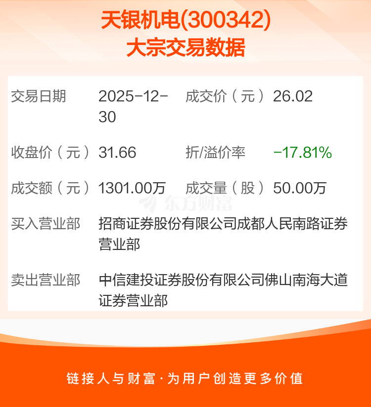 2025年12月30日,天银机电发生1笔大宗交易,共成交50.00万股,成交金额1301.00万元,占其流通市值比例为0.10%。
