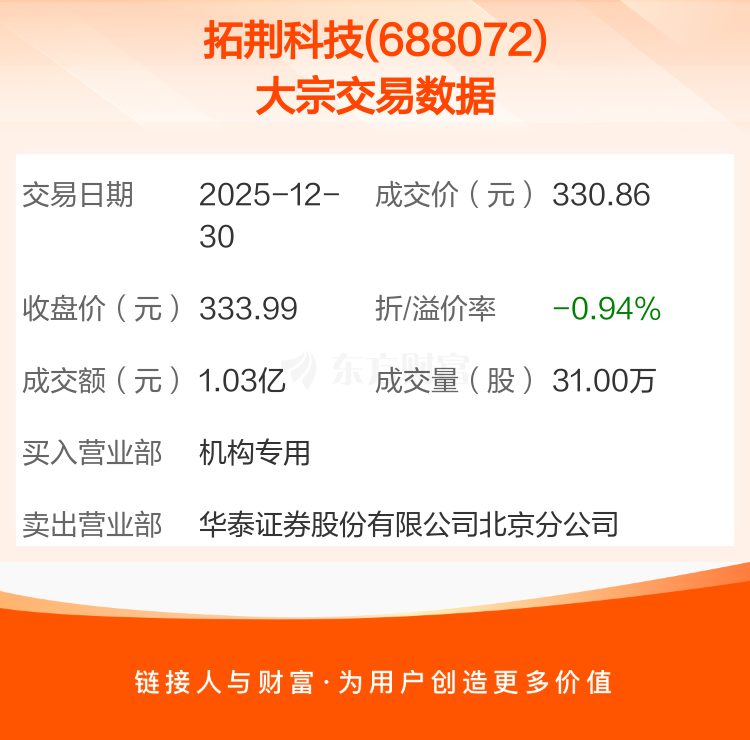 2025年12月30日,拓荆科技发生1笔大宗交易,共成交31.00万股,成交金额1.03亿元,占其流通市值比例为0.11%。