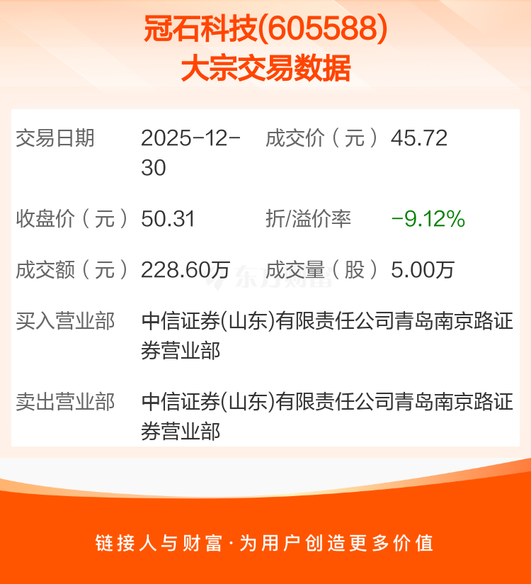 2025年12月30日,冠石科技发生1笔大宗交易,共成交5.00万股,成交金额228.60万元,占其流通市值比例为0.06%。