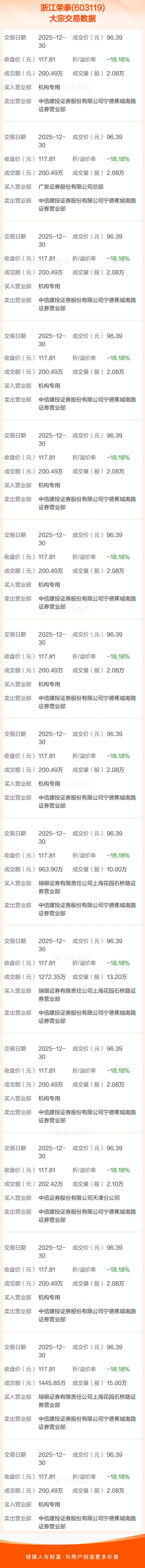 大宗交易:浙江荣泰成交6089.91万元,折价18.18%(12-30)