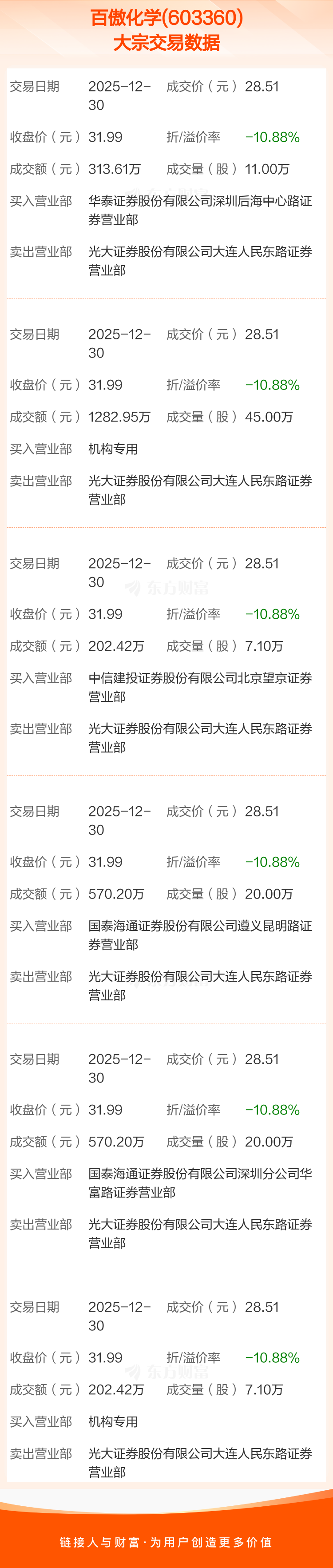 2025年12月30日,百傲化学发生6笔大宗交易,共成交110.20万股,成交金额3141.80万元,占其流通市值比例为0.14%。