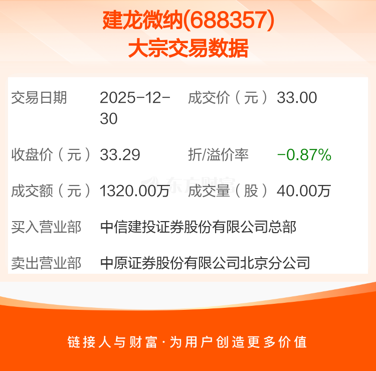 2025年12月30日,建龙微纳发生1笔大宗交易,共成交40.00万股,成交金额1320.00万元,占其流通市值比例为0.40%。