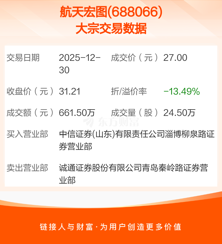 大宗交易:航天宏图成交661.50万元,折价13.49%(12-30)