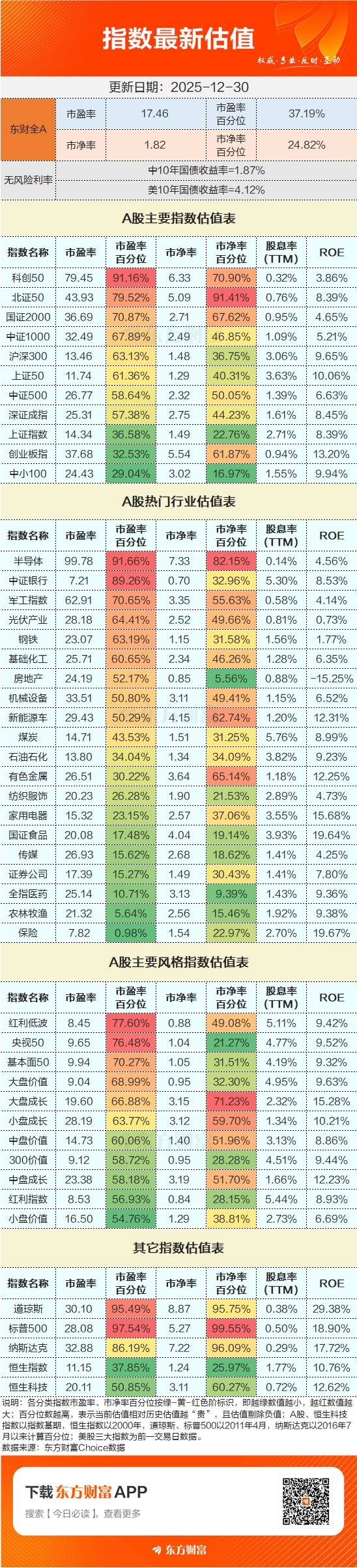 截至12月30日收盘,东方财富Choice数据显示,东财全A市盈率为17.46倍,市盈率百分位为37.19%;市净率为1.82倍,市净率百分位为24.82%。