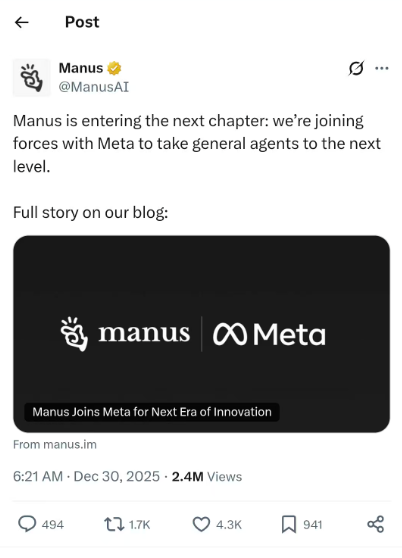 最后,圣诞节前后,在一个硅谷都“人去楼空”的时刻,Manus AI 被巨资买断成为 Meta 旗下的应用,也成为硅谷具有里程碑意义的AI智能体收购案例之一。