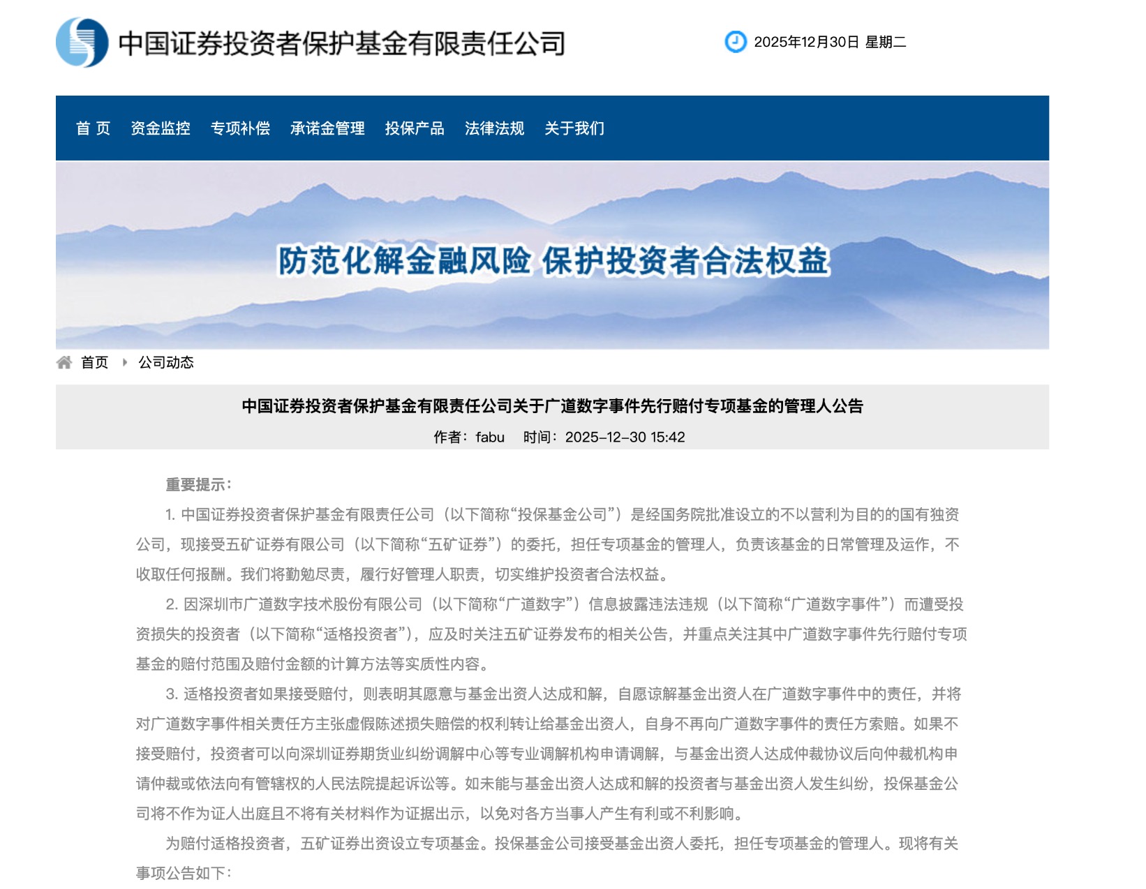 又一先行赔付专项基金设立。12月30日,中国证券投资者保护基金有限责任公司(以下简称“投保基金公司”)发布关于广道数字事件先行赔付专项基金的管理人公告。