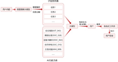通过智能匹配机制为各子任务筛选最优AI能力组合,结合业务规则、资源负载情况与历史应用效果,从能力资产库中动态调取适配的工具、数据与知识资源,形成候选能力集合;再由用户结合业务需求精度要求、操作习惯等因素进行精准优化,既保障了自动化处理的效率,又保留了人工干预的灵活性,充分体现“以用户为中心”的设计理念。