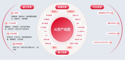 一是开展全域AI资源盘点梳理。组建跨部门专项团队,对公司内部数据、算力、模型、平台等各类资源进行全面排查、分类统计与价值评估。聚焦办公场景核心需求,筛选出具备高业务价值、可流转共享的核心AI能力,形成可视化的全域能力资产地图,如图2所示,清晰呈现资源分布、关联关系与流转路径,为资源优化配置提供直观依据。