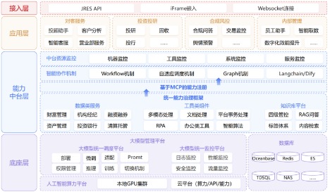 底座层作为核心支撑,整合人工智能算力平台与大模型全生命周期管理系统。算力平台采用“本地GPU集群+云平台资源”的混合架构,本地算力重点保障合规监控、客户画像生成、敏感数据处理等高安全性任务,确保核心数据在可控环境中运行;云端资源满足弹性扩展、外部API集成与突发性算力需求,实现算力资源的灵活调度与最优配置。大模型管理平台支持开源大模型本地化部署、行业适配微调、全流程训练与推理,通过日志监控、性能分析、安全防护、流量控制四维保障体系,确保模型运行稳定可靠。数据支撑方面,整合关系型数据库、内存数据库、搜索引擎、分布式存储等多元存储方案,实现对结构化与非结构化数据的高效存取、实时同步与全生命周期管理,满足不同业务场景的数据处理需求。