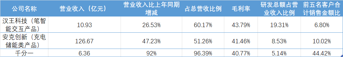 千分一在招股书中提到,电容笔同业公司主要包括汉王科技(002362.SZ)等,后者2013年正式推出主动电容笔产品,笔智能交互业务占比汉王科技总营收的六成。