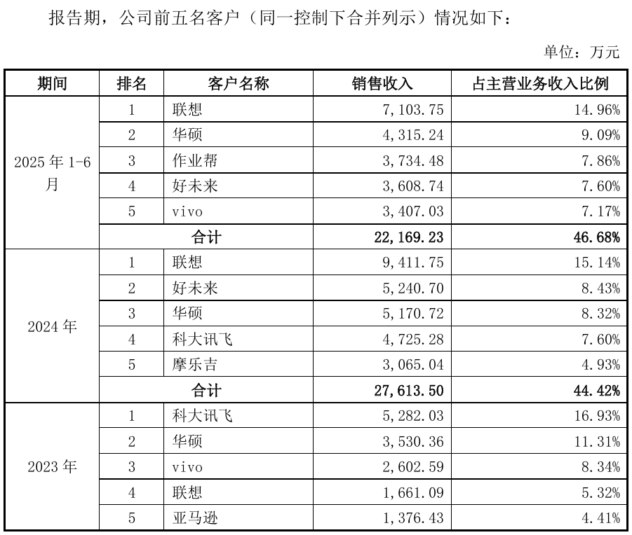 相比之下,2024年汉王科技、安克创新(300866.SZ)前五名客户合计销售金额占年度销售总额比例分别为6.80%、10.02%。