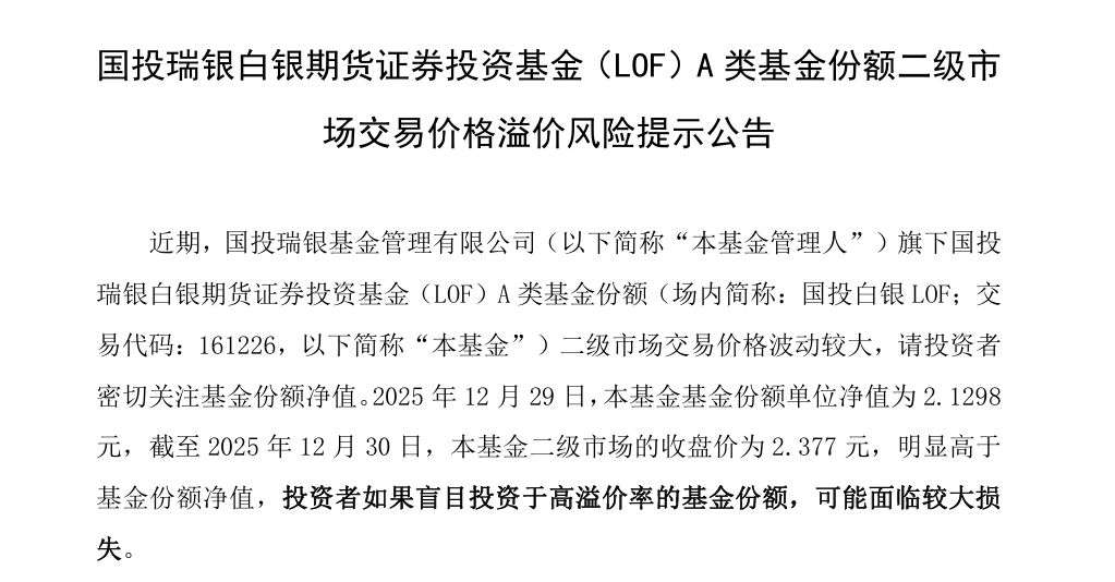 近期,国投瑞银基金管理有限公司旗下国投瑞银白银期货证券投资基金(LOF)A类基金份额二级市场交易价格波动较大,请投资者密切关注基金份额净值。2025年12月29日,本基金基金份额单位净值为2.1298元,截至2025年12月30日,本基金二级市场的收盘价为2.377元,明显高于基金份额净值,投资者如果盲目投资于高溢价率的基金份额,可能面临较大损失。