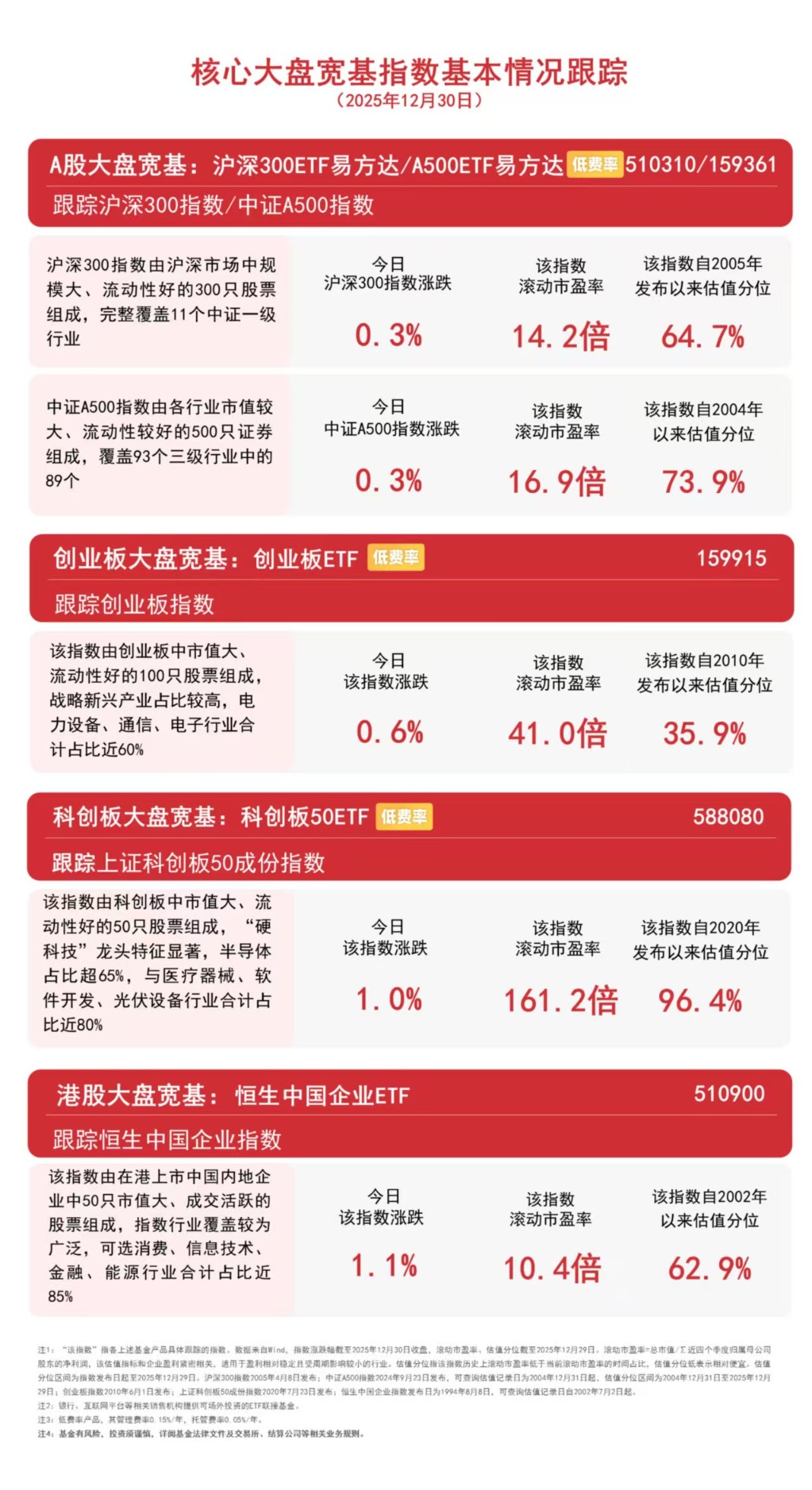12月30日,A股三大指数涨跌不一,沪指低开回升录得十连阳,全市场成交额达2.16万亿元。板块题材上,人形机器人、冰雪旅游、具身智能板块涨幅居前,海南自贸港、光伏玻璃、商业航天板块跌幅居前。港股震荡分化,半导体、石油石化、有色金属板块走强,医药、消费板块走弱。截至收盘,中证A500指数上涨0.3%,沪深300指数上涨0.3%,创业板指数上涨0.6%,上证科创板50成份指数上涨1.0%,恒生中国企业指数上涨1.1%。