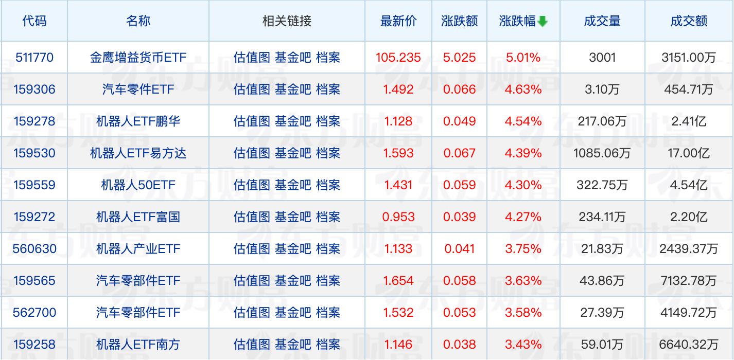 ETF涨跌幅方面,金鹰增益货币ETF涨超5%,汽车零件、机器人相关ETF涨超4%。