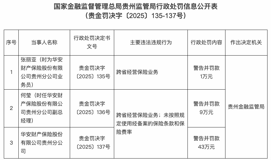 具体来看,华安财产保险股份有限公司贵州分公司因存在跨省经营保险业务、未按照规定使用经备案的保险条款和保险费率的违法违规行为,被国家金融监督管理总局贵州监管局警告并罚款43万元。