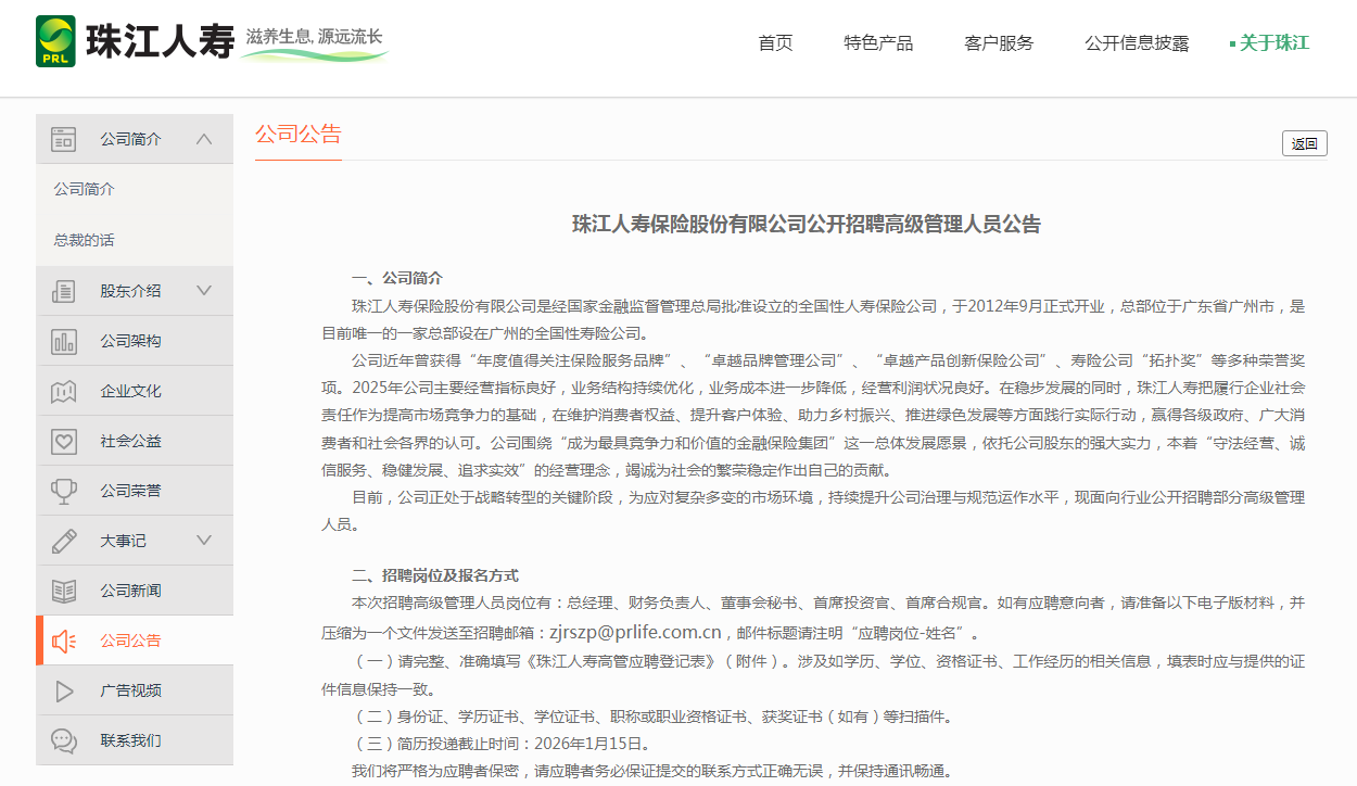 珠江人寿官网发布的公告称,公司正处于战略转型的关键阶段,为应对复杂多变的市场环境,持续提升公司治理与规范运作水平,现面向行业公开招聘部分高级管理人员。具体招聘岗位包括:总经理、财务负责人、董事会秘书、首席投资官、首席合规官。