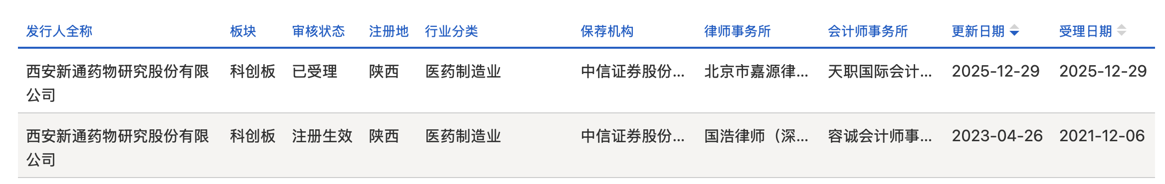 2021年12月末,新通药物向上交所递交了科创板IPO申请,此后经过二轮问询后在2023年初顺利过会,并于当年4月25日获得证监会注册生效批复。