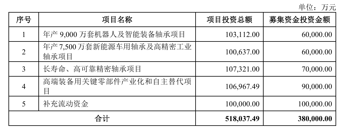 本次冲击上市,人本股份拟募集资金38亿元,扣除发行费用后将投入年产9000万套机器人及智能装备轴承项目、年产7500万套新能源车用轴承及高精密工业轴承项目、长寿命、高可靠精密轴承项目、高端装备用关键零部件产业化和自主替代项目。