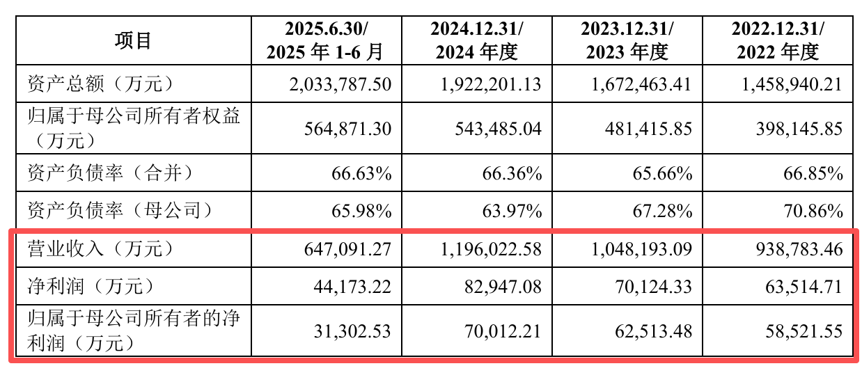 2022年至2024年及2025年上半年(下称“报告期”),公司营业收入分别为93.88亿元、104.82亿元、119.60亿元和64.71亿元;归母净利润分别为5.85亿元、6.25亿元、7亿元和3.13亿元。