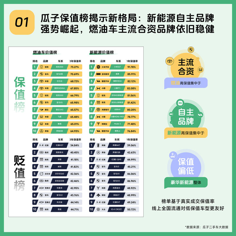 因此,对于车主而言,卖车时的保值率参考,首先得选对、选准;一份数据来源真实、全面,能够反映全国市场动态的保值率榜单更具价值。例如报告中保值率榜单,依托的是瓜子全国性的交易网络,基于平台全年真实成交数据生成,而非抽样调查或局部数据。这种基于海量真实交易数据而来的保值率榜单比区域性调研或单一渠道的数据更能全面、客观地反映全国二手车市场的真实行情和消费趋势,对消费者更具有参考价值。