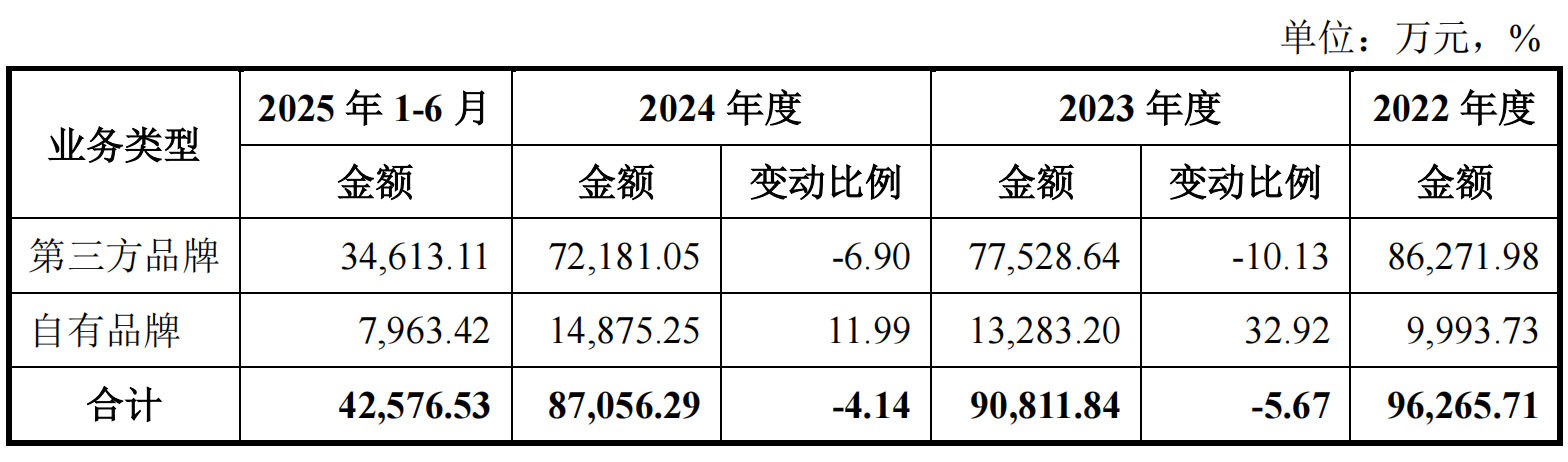 报告期各年度,公司第三方品牌收入分别下滑10.13%和6.90%,自有品牌收入分别增长32.92%和11.99%。