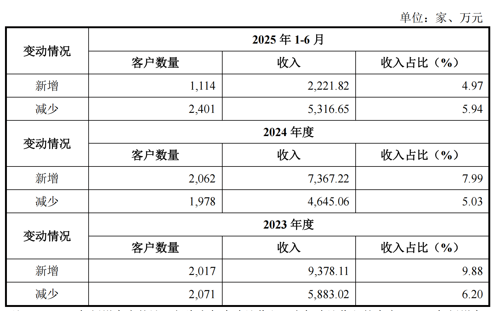金万众在招股书中披露了新增和减少的客户情况。今年上半年,公司客户数量减少2401家,仅新增1114家,减少了5316.65万元收入。