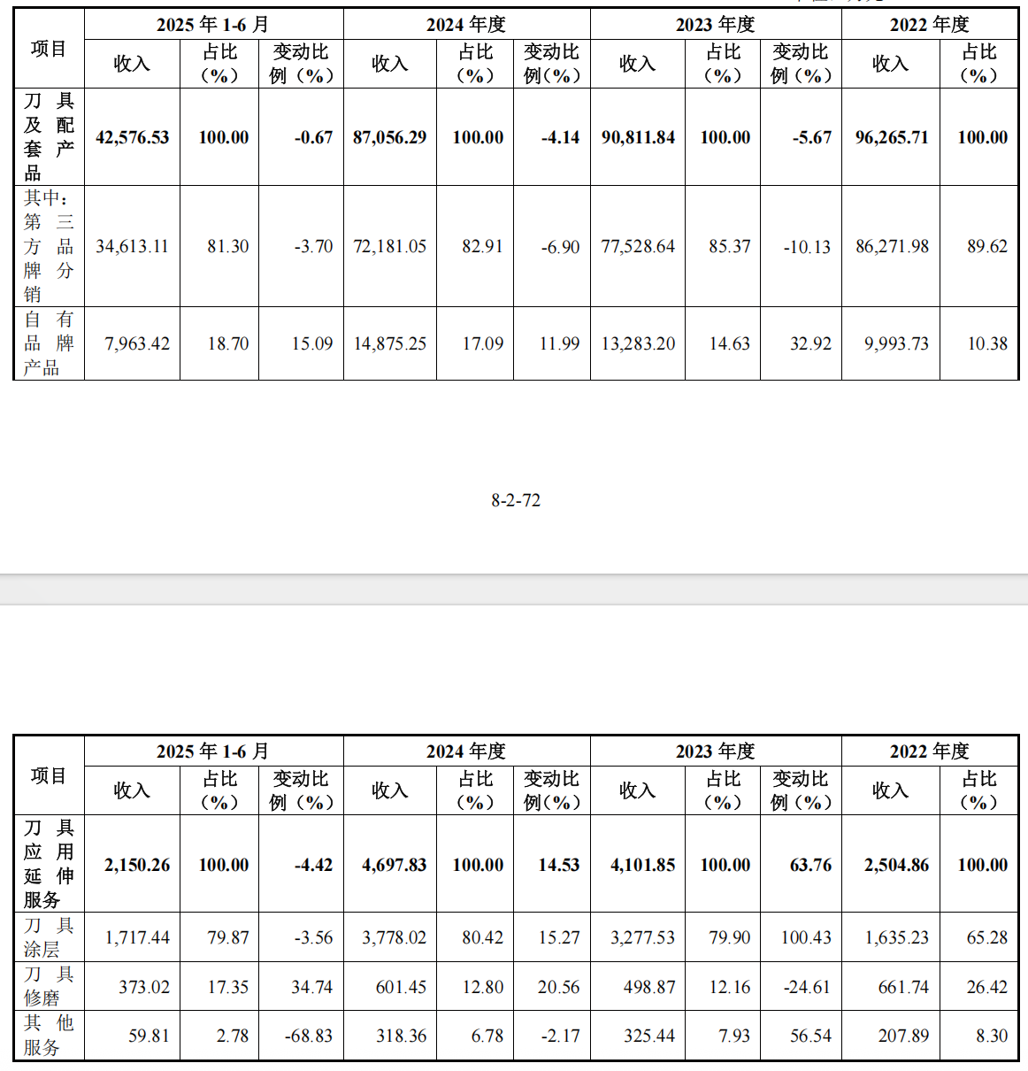 报告期各期,公司刀具及配套产品销售实现收入分别为9.63亿元、9.08亿元、8.71亿元和4.26亿元。2023年、2024年及2025年1~6月,同比分别下降5.67%、4.14%和0.67%。