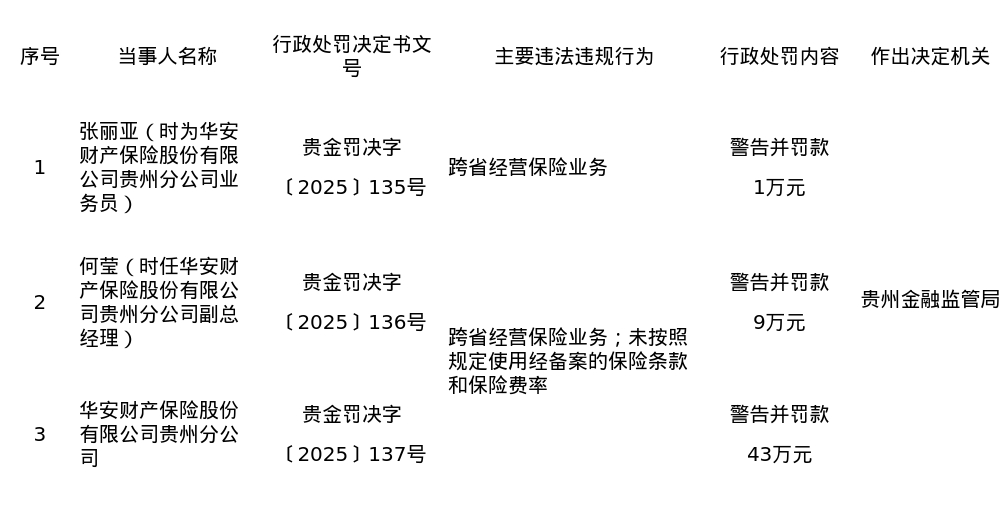 针对以上问题,国家金融监督管理总局贵州监管分局对其警告并处以43万元罚款;对华安财险贵州分公司副总经理何莹,警告并处以9万元罚款;对华安财险贵州分公司业务员张丽亚,警告并处以1万元罚款。