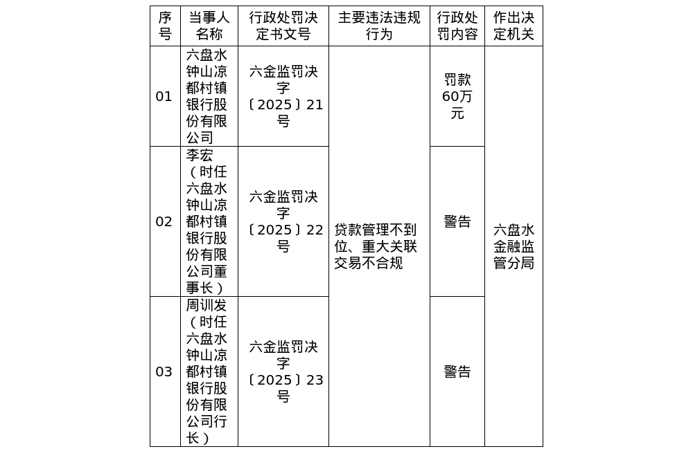 罚单显示,六盘水钟山凉都村镇银行股份有限公司的主要违法违规事实(案由)为:贷款管理不到位、重大关联交易不合规。