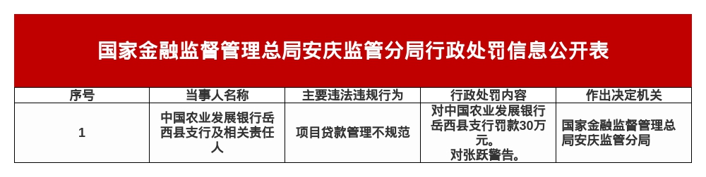 农发行岳西支行被罚30万,涉项目贷款管理不规范