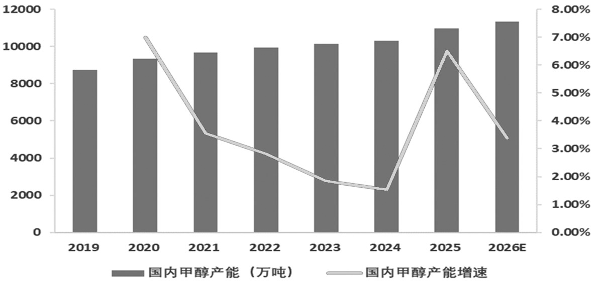 2025年,国内甲醇产能增加705万吨,产能增速为6.51%。其中,一体化产能增加660万吨/年,非一体化产能增加10万吨/年,绿色甲醇产能增加35万吨/年。考虑到一体化产能配套有下游加工装置,而绿色甲醇对传统甲醇的替代作用不大,因此实际可流通的甲醇增量寥寥无几,仅在10万吨/年。2026年,虽然国内甲醇产能继续增加370万吨,但产能增速放缓至3.38%。与2025年类似,增量主要由一体化装置贡献,实际可以外放流通的甲醇增量仅有20万吨,国内甲醇的非一体化投产基本达峰。