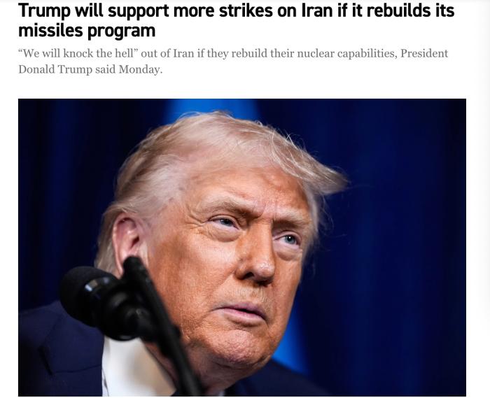 据报道,特朗普表示,如果伊朗试图重新发展核能力,他将支持以色列对伊朗发起打击,并誓言“我们将狠狠打击他们”。