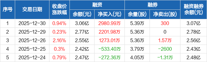 融资方面,当日融资买入4470.55万元,融资偿还1489.55万元,融资净买入2980.99万元,连续3日净买入累计6455.99万元。融券方面,融券卖出6000股,融券偿还5700股,融券余量5.39万股,融券余额92.92万元。融资融券余额合计3.07亿元。