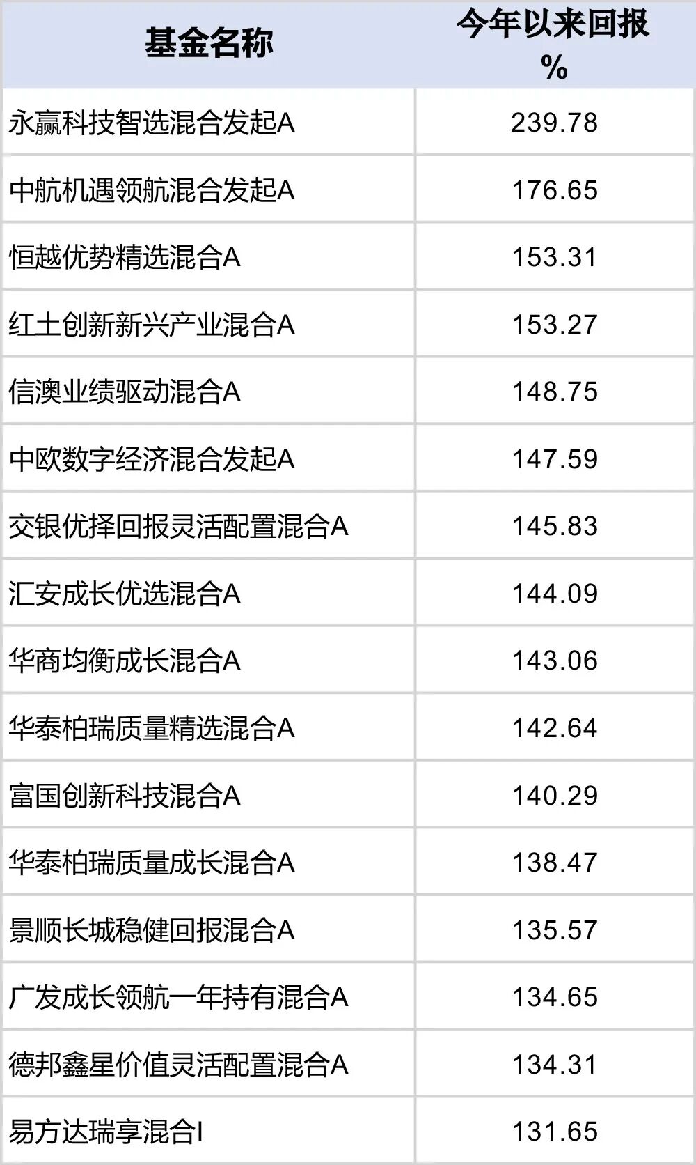 在业绩翻倍的基金中,永赢科技智选混合基金以239.78%的年内收益率大幅领跑,中航机遇领航混合基金以176.65%的年内收益率位居第二。第三名和第四名分别为年内收益率153.31%的恒越优势精选混合基金和年内收益率153.27%的红土创新新兴产业混合基金,两者已非常接近。