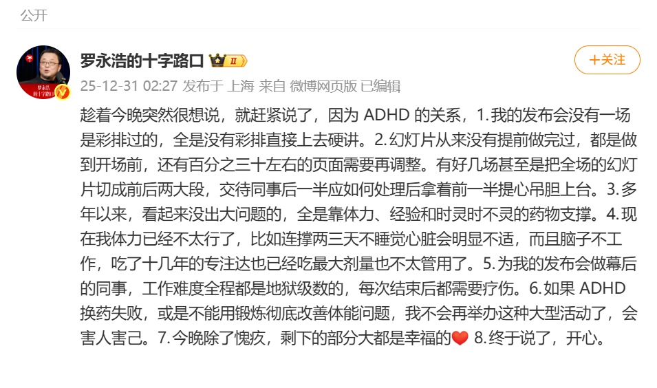 罗永浩回应“科技春晚”迟到40分钟:如ADHD换药失败或不能改善体能,不会再举办这种大型活动