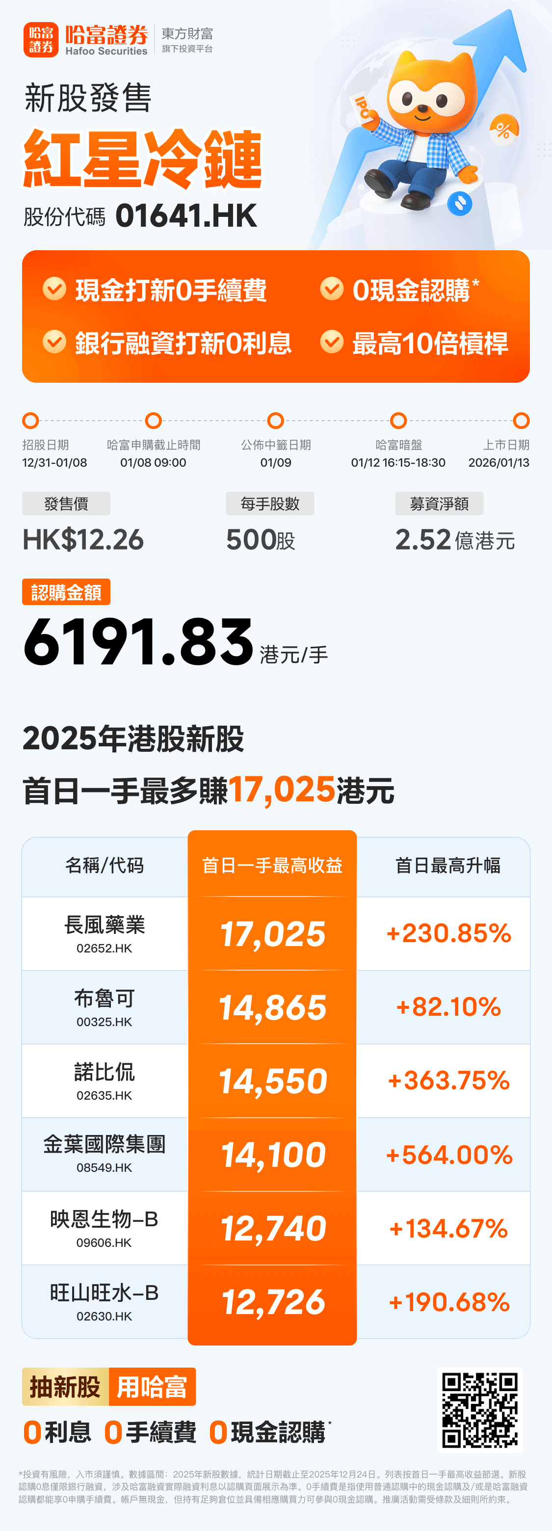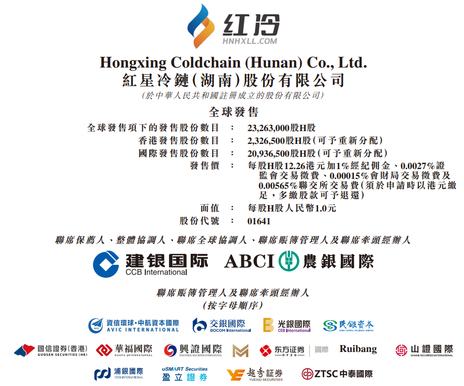 12月31日,红星冷链于12月31日至1月8日招股,公司拟全球发售2326.3万股H股,其中,香港发售占10%,国际发售占90%。每股发售价12.26港元,H股每手买卖单位为500股,预期将于1月13日起开始在联交所买卖。