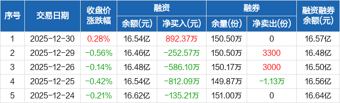 纳指ETF:融资净买入892.37万元,融资余额16.54亿元(12-30)