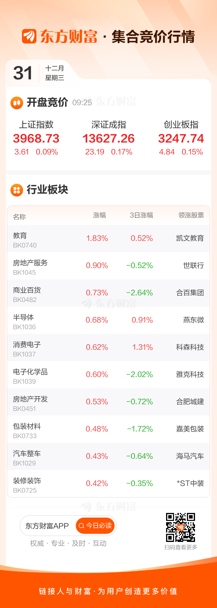 12月31日,三大指数集体高开,上证指数高开0.09%,深证成指高开0.17%,创业板指高开0.15%。板块方面,教育领涨,凯文教育涨5.25%,房地产服务、商业百货等开盘涨幅居前。