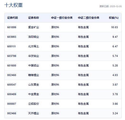 根据中证指数官网数据,有色矿业ETF招商(159690)跟踪的有色矿业指数,紫金矿业权重占比10.03%。