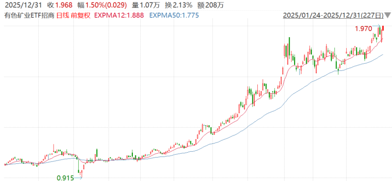 有色矿业ETF招商(159690)紧密跟踪有色矿业指数,集中投资于拥有上游矿产资源的企业,包括北方稀土、紫金矿业、洛阳钼业、华友钴业、中国铝业、山东黄金等拥有大量资源储量的公司。截至12月30日,中证有色金属矿业主题指数年内涨幅超102%,同期中证申万有色金属指数涨超95%,相比来看表现更具弹性。