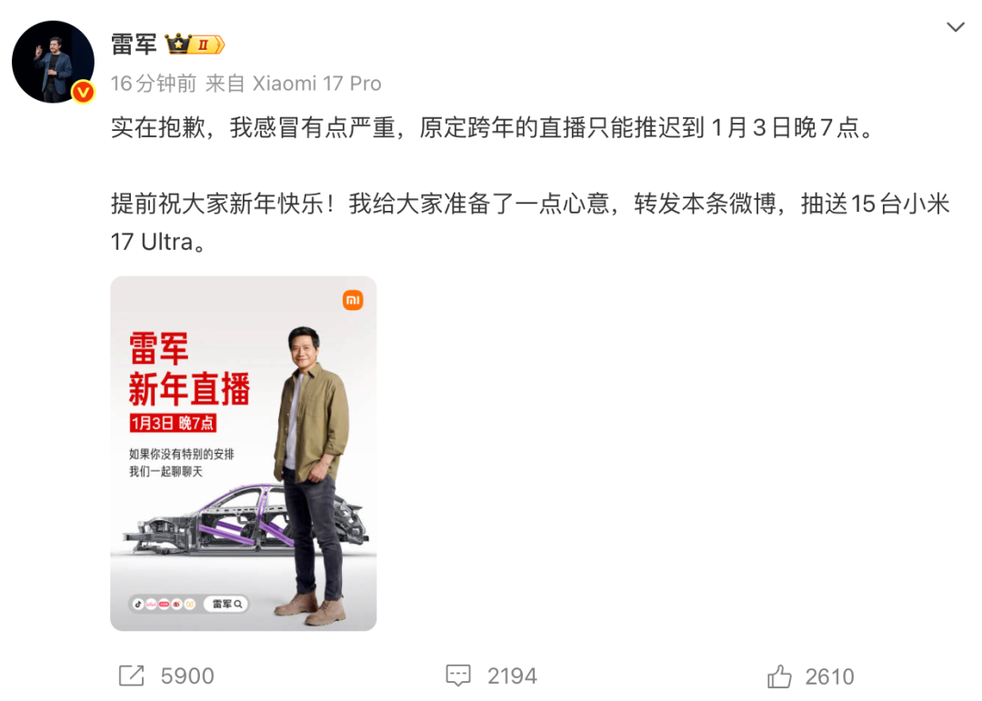 12月31日,雷军发文称,由于感冒严重,将原定的跨年直播推迟到1月3日晚7点。