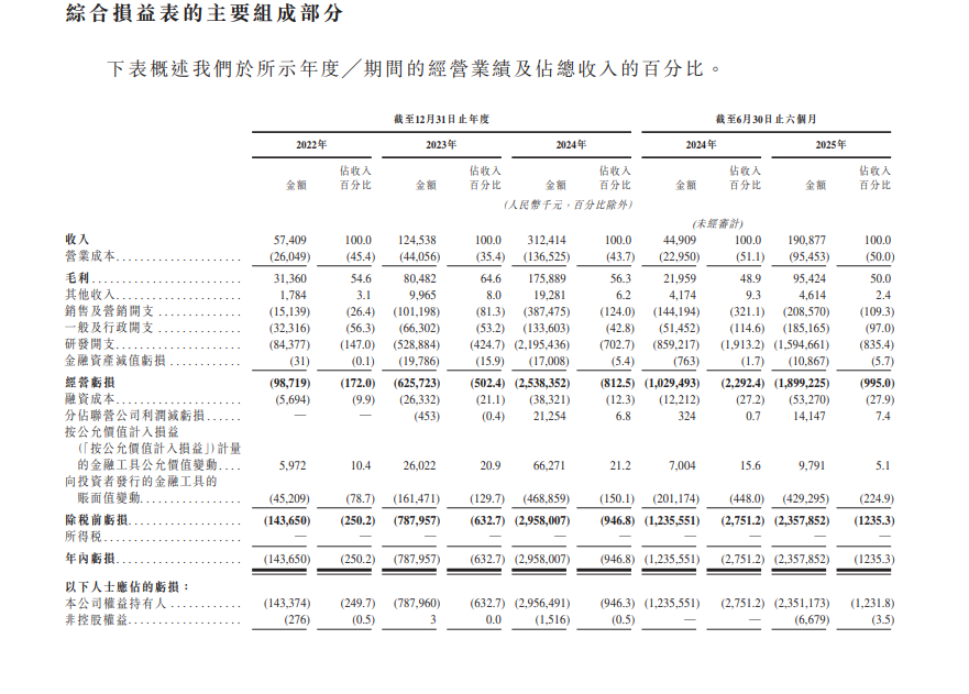 智谱近年呈现出“高增长、高投入、高亏损”的典型科技企业发展特征。招股书数据显示,2022年至2024年,公司营业收入从5740万元快速攀升至3.12亿元,年复合增长率高达130%;2025年上半年营收进一步增至1.91亿元,同比增幅达325%。公司毛利率2022年至2024年分别为54.6%、64.6%、56.3%。